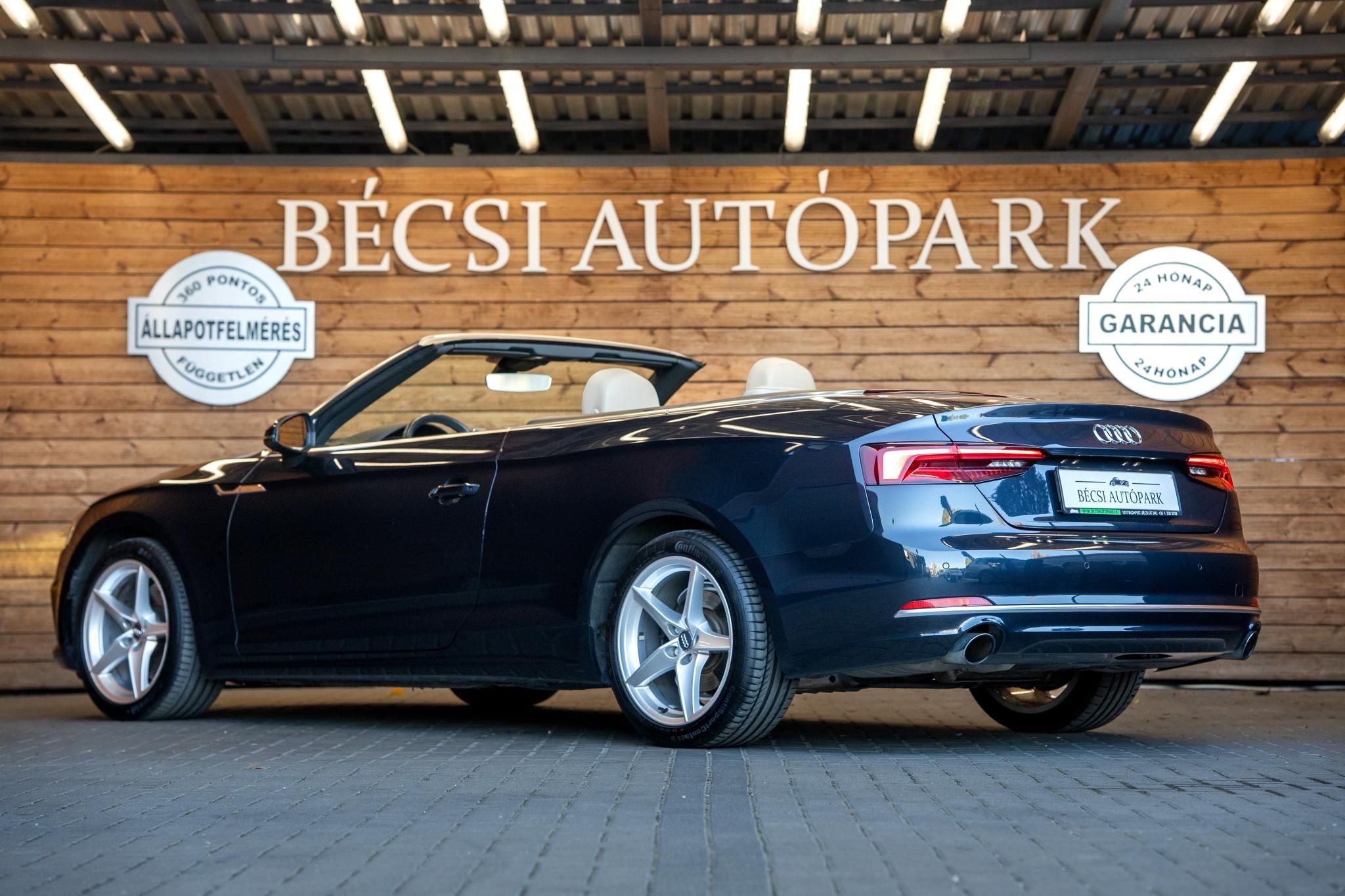 BLACK WEEK AKCIÓS ÁR KORLÁTOZOTT IDEIG!—–Audi A5 Cabrio, 1984ccm, benzines automata, 360 PONTOS FÜGGETLEN ÁLLAPOTFELMÉRÉSSEL, 1 ÉV AJÁNDÉK GARANCIÁVAL, sötét kék metál fényezéssel és 18 colos alufelnikkel eladó. Motorja egy 190 lóerős benzines erőforrás amit egy automata váltóval szereltek. Kényelmi extrái között megtalálható a 3 zónás digitális klíma, elektromosan kezelhető tükrök, motorosan nyitható vászon tető, ülésfűtés, automata elektromos rögzítő fék rendszer és a szintén automata ledes fényszóró kapcsolás. A vezetést támogató rendszerek közül érdemes megemlíteni a tempomatot, tolató radarokat elöl-hátul, koccanás gátlót, fáradtság figyelő rendszert és a vezetés mód választót. A családi csomag része a kikapcsolható utaslégzsák és az isofix gyerekülés rögzítési pontok. További biztonsági extrák az abs, menetstabilizátor és a légszák rendszer. A központi szórakoztató egység része a multifunkciós média egység, navigációval, android és apple carplay rendszerű telefon tükrözési lehetőséggel. Az autó kevés megtett kilométerrel 2db kulccsal várja új tulajdonosát.